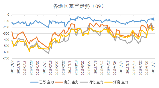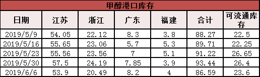 上周现货市场价格经历较大幅度跌势,截止6月6日,华东、华中、华南等地一周内下滑120元/吨左右,西北内蒙以及陕西部分地区价格跌幅相对更大,其中内蒙下跌达到170元/吨。周内现货市场的大幅下跌受期货盘面影响明显。6月3日,原油期货盘中跌停,甲醇1909主力合约也封跌停板,未来预期不佳导致市场信心受挫,有货者多降价出货。据卓创库存数据显示,上周张家港、常州库存持续减少,内地与常州地区套利窗口不稳定使得常州地区库存不断流出。